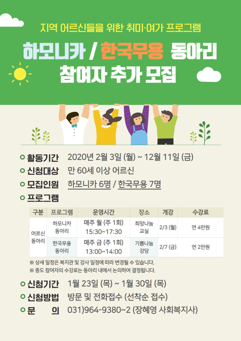 지역 어르신들을 위한 취미·여가 프로그램 '하모니카/한국무용 동아리' 참여자 추가 모집 안내 페이지 정보 작성자 관리자 댓글 0건 조회364회 작성일 20-01-22 17:34 목록 본문 이전글장애인 여가프로그램 (공예활동) "손으로 만드는 세상" 참여자 모집 19.12.06 다음글원흥실버대학, 원흥문해교실 참여자 모집 20.01.09 댓글 0 댓글목록 등록된 댓글이 없습니다.