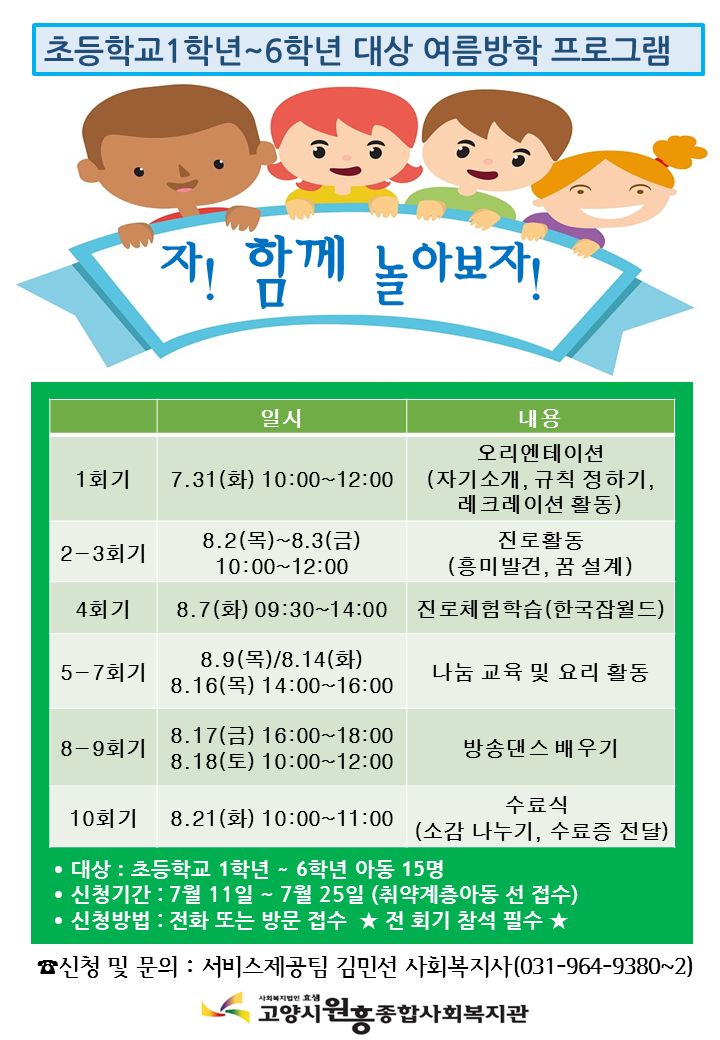 2018년 아동대상 여름방학 프로그램 "자,함께 놀아보자!" 참여자 모집 안내 페이지 정보 작성자 관리자 댓글 0건 조회412회 작성일 18-07-11 09:57 목록 본문 이전글2018년도 시원한 여름나기 후원자·자원봉사자 모집 18.06.14 다음글환경살림 주민동아리 이엠이랑 "찾아가는 EM교육" 참여자 모집 18.06.26 댓글 0 댓글목록 등록된 댓글이 없습니다.