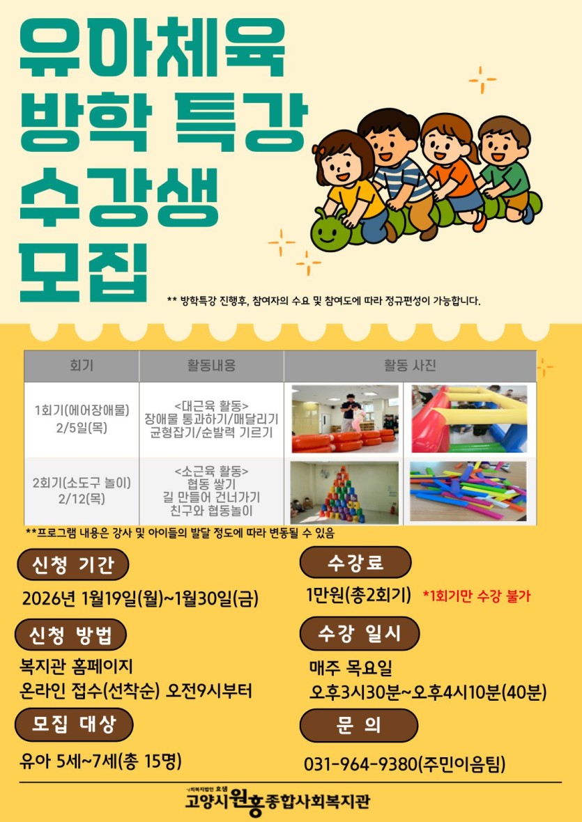 2026년 평생교육 아동 방학프로그램 페이지 정보 작성자 원흥종합사회복지관 댓글 0건 조회3회 작성일 26-01-19 11:13 목록 본문 . 이전글2026년 아동방학특강 프로그램 수강생 모집 26.01.19 다음글2026년 평생교육 재능나눔 강사 모집 안내 26.01.05 댓글 0 댓글목록 등록된 댓글이 없습니다.