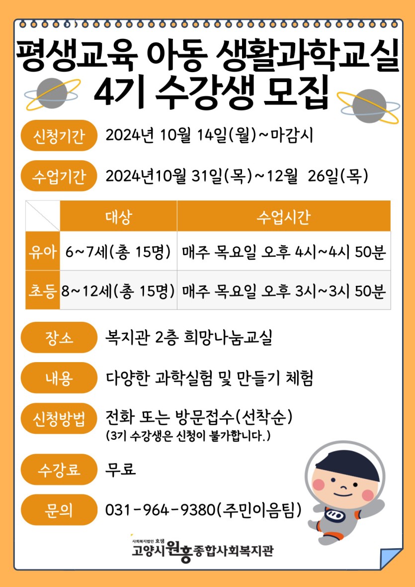 2024년 4기 아동 생활과학교실 수강생 모집