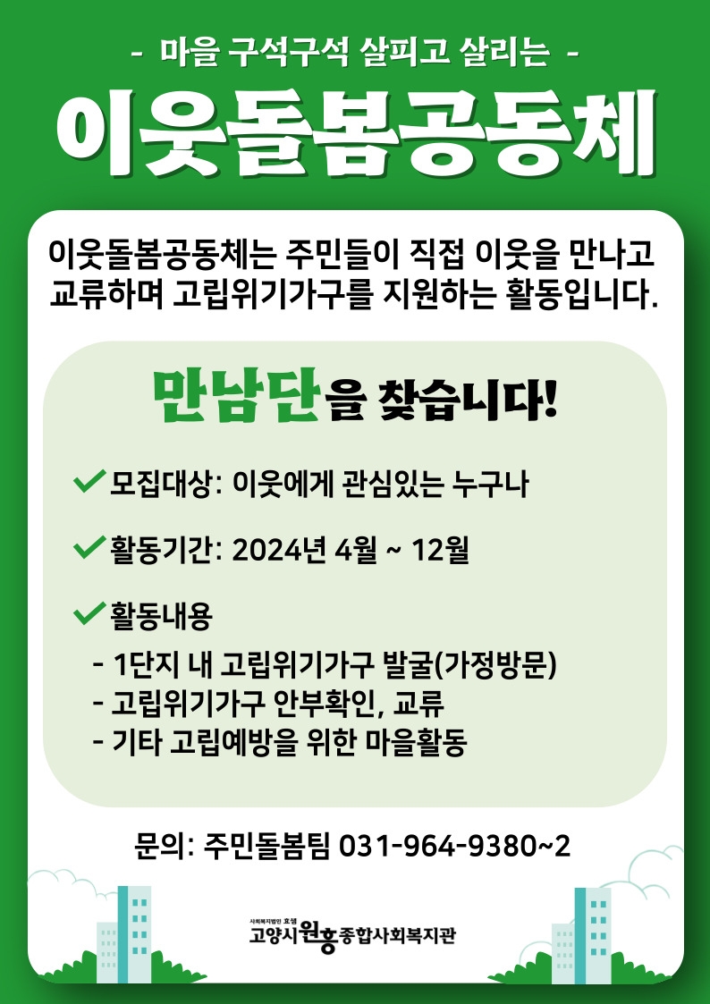 고양시원흥종합사회복지관은 2024년부터 이웃과 이웃을 잇는 이웃돌봄공동체 사업을 시작합니다!