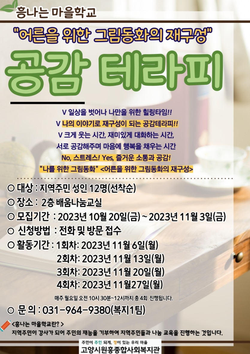 어른을 위한 그림동화의 재구성 "공감테라피" 프로그램에 많은 참여 바랍니다. 페이지 정보 작성자 관리자 댓글 0건 조회415회 작성일 23-10-23 10:00 목록 본문 이전글<흥나는 마을학교 3탄- 엄마들을 위한 그림 동화 모임>육아의 고민과 사춘기 아이와의 원활한 소통을 하고 싶으신가요? 23.09.27 다음글원흥마을, 인권의 씨앗을 심다! <영화로 보는 인권이야기> 프로그램 안내 18.04.10 댓글 0 댓글목록 등록된 댓글이 없습니다.