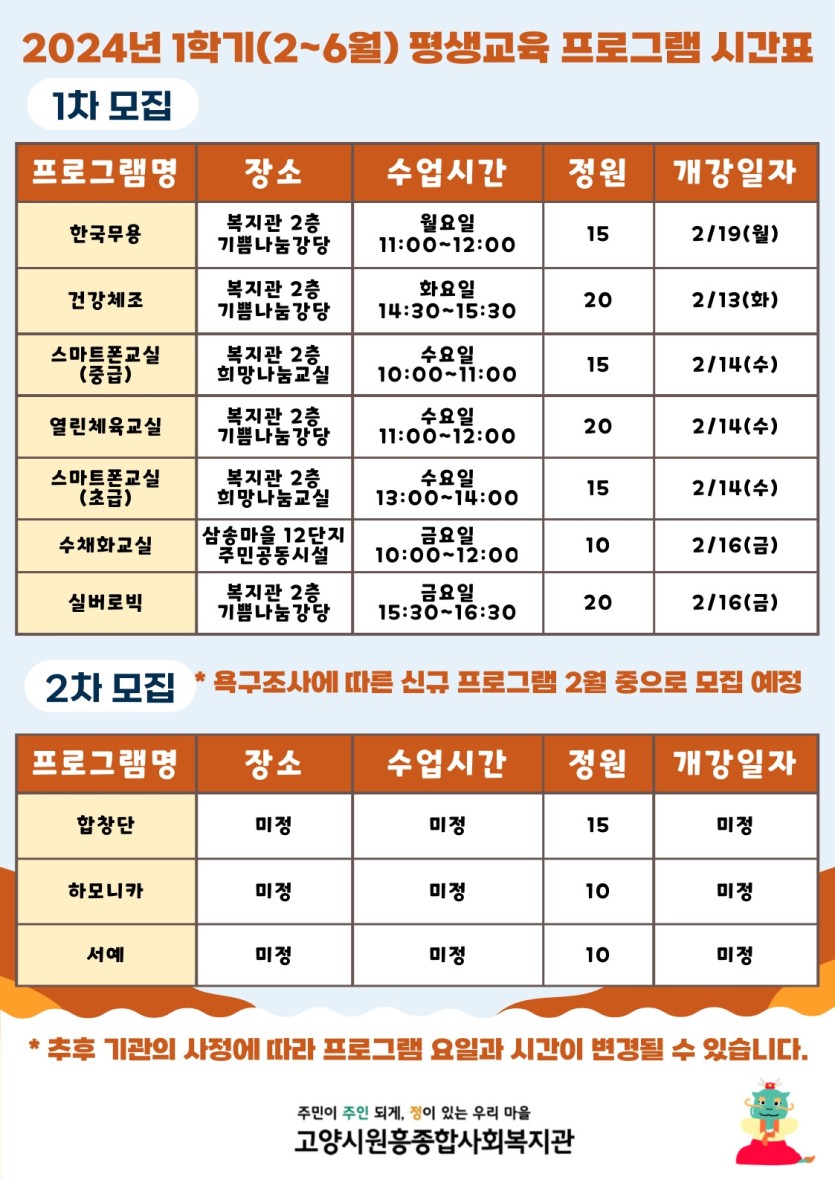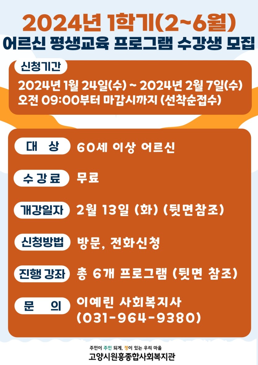 2024년 1학기(2~6월) 어르신 평생교육 프로그램 수강생 모집 안내