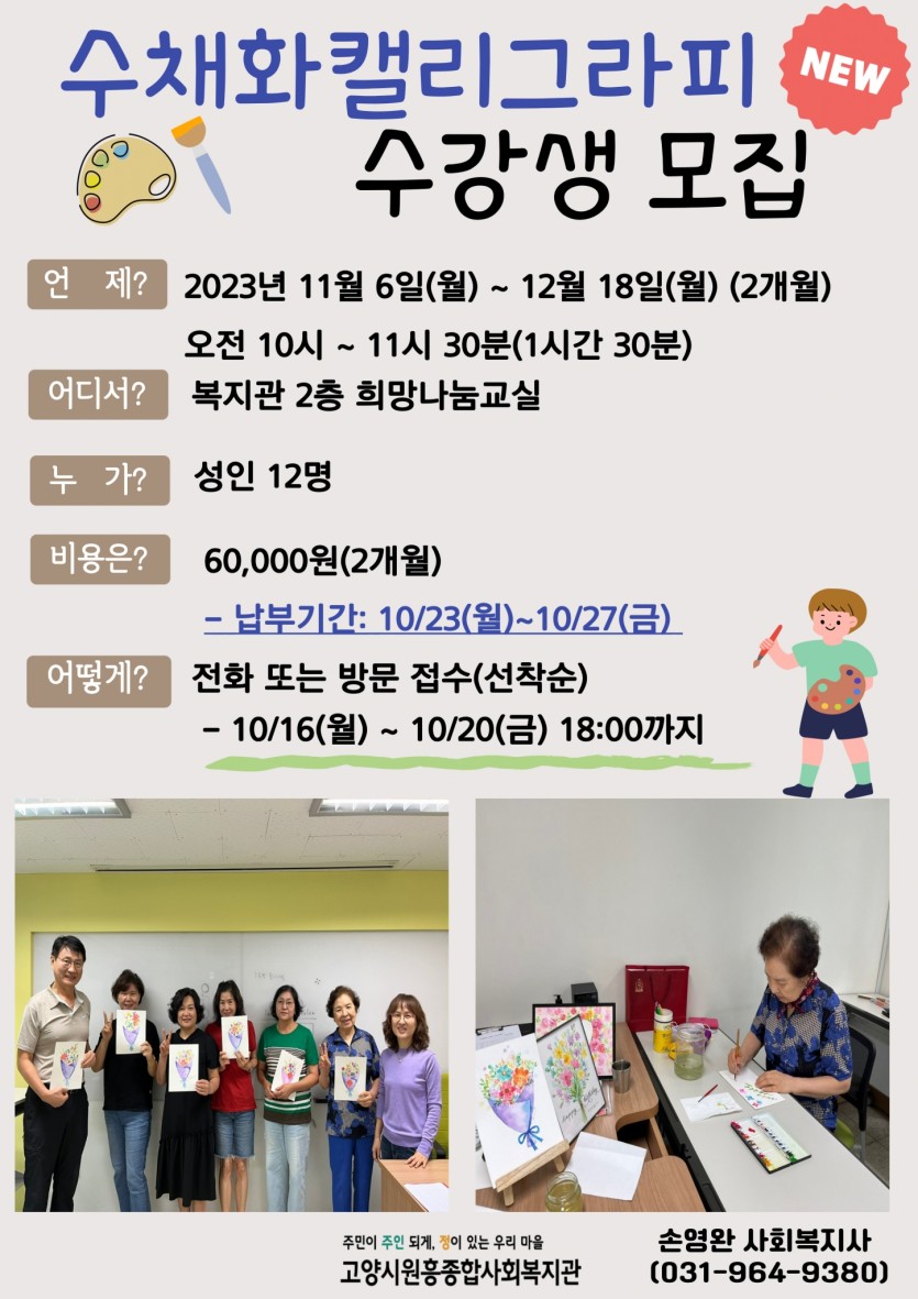 [평생교육] 수채화캘리그래피 수강생 모집합니다. 페이지 정보 작성자 관리자 댓글 0건 조회437회 작성일 23-10-13 15:32 목록 본문 이전글신규 주민모임<투개(犬)더> 참여자 모집 합니다. 24.03.11 다음글흥도동주민자치회와 함께하는 아동 여름방학 무료 프로그램 수강생 모집 23.07.05 댓글 0 댓글목록 등록된 댓글이 없습니다.