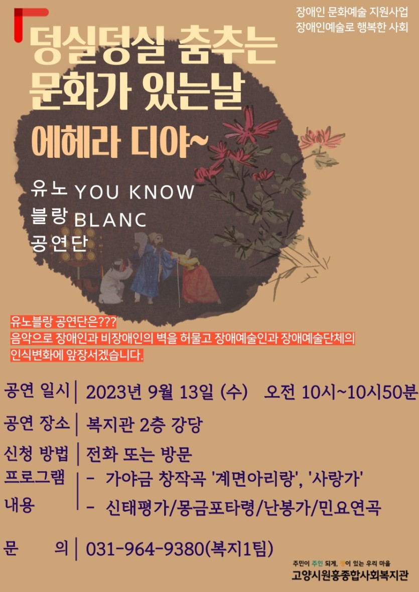 [신청접수] 문화무료공연 경기민요 국악단 공연 관람 참여자를 모집합니다. 페이지 정보 작성자 관리자 댓글 0건 조회321회 작성일 23-08-28 18:25 목록 본문 이전글2023년 4분기(10~12월) 평생교육 프로그램 수강생 모집 안내 23.09.04 다음글2023년 성인 수채캘리그라피 오픈클래스 수강생 모집 23.09.08 댓글 0 댓글목록 등록된 댓글이 없습니다.