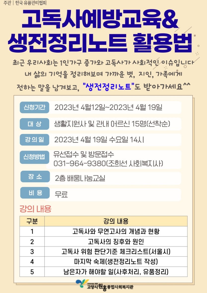 2023년 고독사예방 및 생전정리노트 교육 참여자 모집 페이지 정보 작성자 관리자 댓글 0건 조회320회 작성일 23-04-14 13:51 목록 본문 이전글아동 생활과학교실(유아반, 초등반) 2기 평생교육 프로그램 수강생 모집 23.05.15 다음글2023년 탄소다이어트 환경모임 참여자 모집 23.04.13 댓글 0 댓글목록 등록된 댓글이 없습니다.