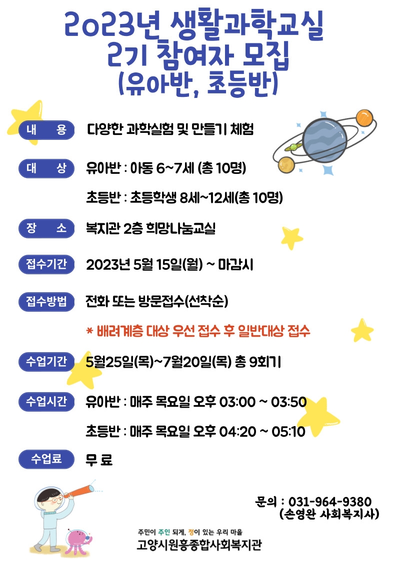 아동 생활과학교실(유아반, 초등반) 2기 평생교육 프로그램 수강생 모집