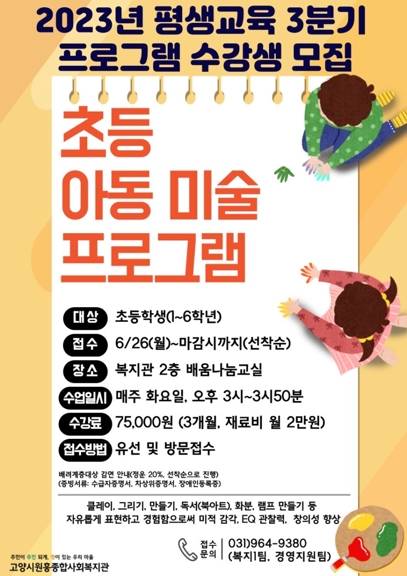 평생교육 초등 아동미술 프로그램 수강생 추가 모집 페이지 정보 작성자 관리자 댓글 0건 조회378회 작성일 23-06-28 09:06 목록 본문 이전글2023년 3분기(7~9월) 평생교육(성인, 아동, 장애인) 프로그램 수강생 모집 안내 23.06.12 다음글어르신인조이스쿨 2학기 수강생 모집 안내 및 프로그램 23.06.28 댓글 0 댓글목록 등록된 댓글이 없습니다.