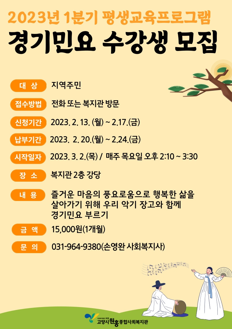 2023년 1분기 경기민요 평생교육프로그램(성인) 수강생 모집 페이지 정보 작성자 관리자 댓글 0건 조회316회 작성일 23-02-09 10:39 목록 본문 !고양시원흥종합사회복지관에서 경기민요 평생교육프로그램 수강생을 모집합니다! 모집대상: 지역주민 접수기간: 2023. 2. 13.(월) ~ 2. 17.(금) 개강일자: 2023. 3. 2.(목) 오후 2:10 ~ 3:30 접수방법: 전화 또는 복지관 방문(031-964-9380) 복지관에서 진행하는 경기민요 프로그램에 많은 참여부탁드립니다. 이전글뇌건강 보드게임 참여자 모집 안내 23.03.16 다음글2023년 어르신 평생교육 프로그램 수강생 모집 23.01.30 댓글 0 댓글목록 등록된 댓글이 없습니다.
