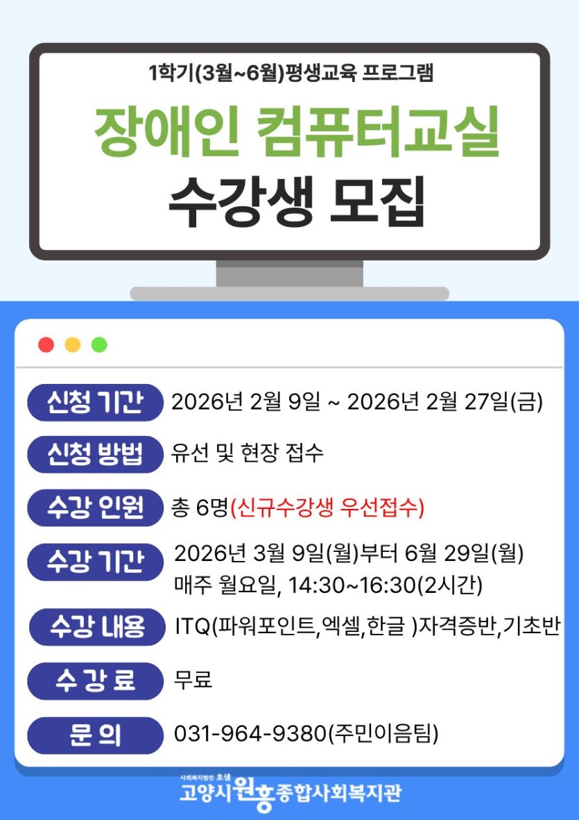 2026년 장애인 컴퓨터교실 1학기 수강생 모집 페이지 정보 작성자 원흥종합사회복지관 댓글 0건 조회33회 작성일 26-02-06 14:57 목록 본문 . 다음글2026년 동계실습생과 함께하는 "근모닝 10분" 체육프로그램 수강생을 모집합니다. 26.01.20 댓글 0 댓글목록 등록된 댓글이 없습니다.