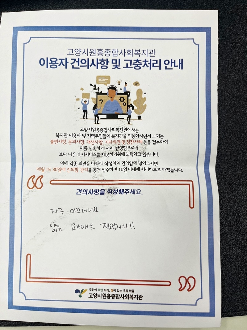 늘 많은 관심 부탁드리며 지역주민분들의 소중한 의견에 발빠르게 움직이는 고양시원흥종합사회복지관이 되겠습니다!