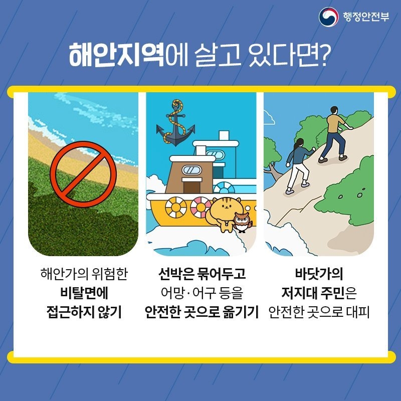 외출 자제, 응급 상황 대비 사전 비상 연락망 숙지, 대피장소 파악 등 대비 방법을 알아보고 피해를 사전에 예방하시길 바랍니다.