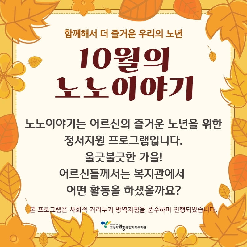10월 노노이야기 활동 페이지 정보 작성자 관리자 댓글 0건 조회320회 작성일 21-11-08 15:24 목록 본문 이전글2021년 10월 과일봉사단 진행 21.11.11 다음글2021년 이용자 인권교육 진행 21.11.08 댓글 0 댓글목록 등록된 댓글이 없습니다.