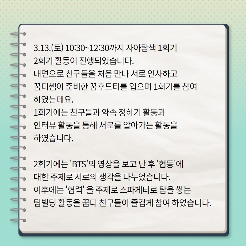 3월 달 꿈디자이너 친구들과 자아탐색 프로그램을 3.13(토) / 3.27.(토) 에 대면활동으로 복지관에서 진행을 하게 되었습니다.