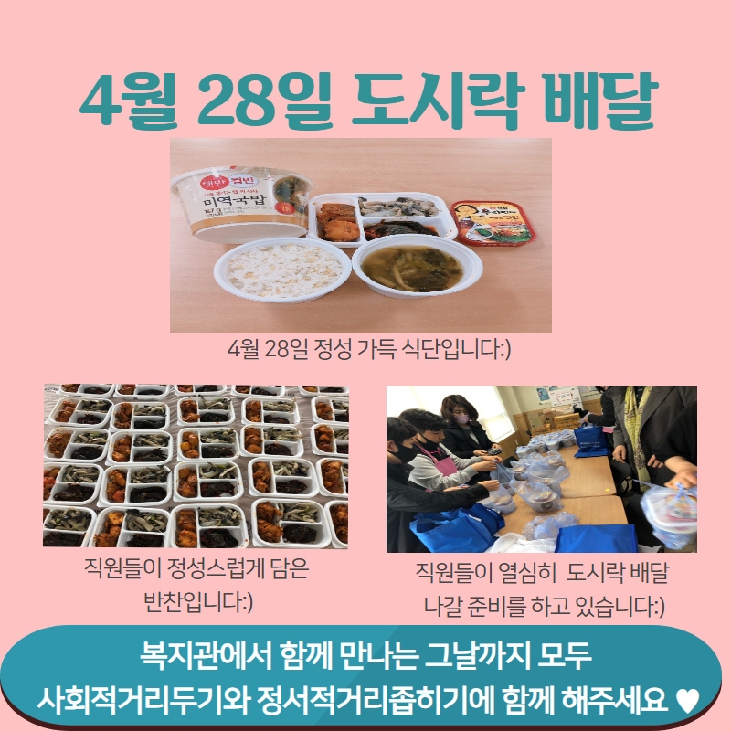 4월 28일 코로나19 확산방지를 위한 경로식당 이용자 분들 대상 도시락 배달 진행 페이지 정보 작성자 관리자 댓글 0건 조회265회 작성일 20-05-04 13:04 목록 본문 이전글4월 29일 코로나19 확산방지를 위한 경로식당 이용자 분들 대상 도시락 배달 진행 20.05.04 다음글4월 27일 코로나19 확산방지를 위한 경로식당 이용자 분들 대상 도시락 배달 진행 20.04.28 댓글 0 댓글목록 등록된 댓글이 없습니다.