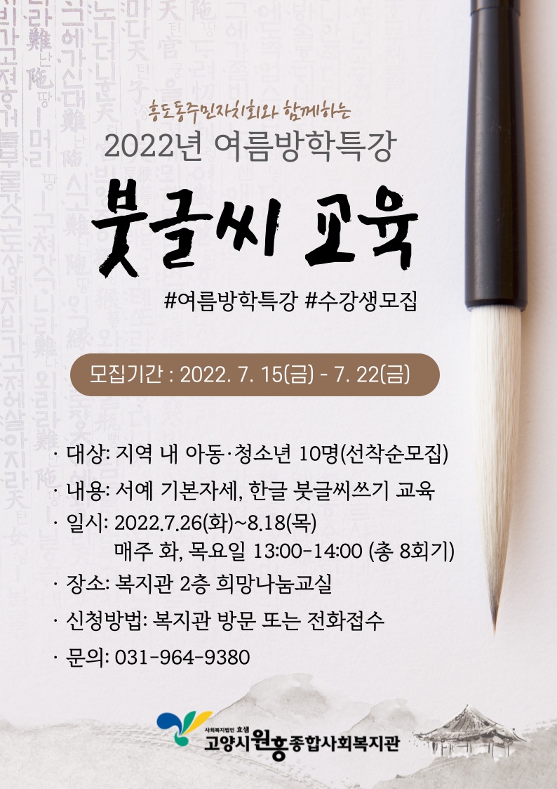 2022년 여름방학특강 아동, 청소년 붓글씨교육 페이지 정보 작성자 관리자 댓글 0건 조회265회 작성일 22-07-25 12:12 목록 본문 이전글수미네 홈쿠킹 '함께 요리 하실래요?? 20.12.11 다음글멋쟁이 실버스타일 홍보(어르신 커트, 염색, 메니큐어 등) 22.10.07 댓글 0 댓글목록 등록된 댓글이 없습니다.