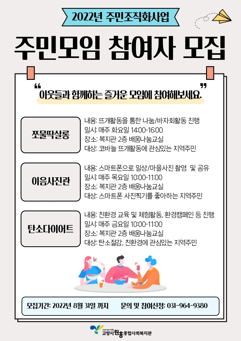 주민모임 참여를 희망하시는 지역주민 분들의 많은 관심과 참여 부탁드립니다.