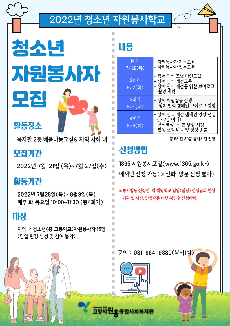 <청소년 자원봉사자 모집> 활동장소 : 복지관 2층 배움나눔교실& 지역 사회 내 모집기간 : 2022년 7월 21일(목) ~ 2022년 7월 27일(수) 활동기간 : 2022년 7월 28일(목) ~ 2022년 8월 9일(목) 매주 화, 목 10:00~11:30 (총4회기) (총6시간 30분 활동시간 인정) 대상 : 지역내 청소년(중/고등학교) 자원봉사자 15명(당일 현장 신청 및 참여 불가) 내용 : 1회기 - 자원봉사자 기본교육. 자원봉사자 필수교육, 내가 생각하는 자원봉사란? 2회기 - 장애인식 조별 마인드맵, 장애인식 개선교육, 장애인식개선을 위한 브이로그 촬영 계획 3회기 - 장애체험활동 진행, 장애인식캠페인 브이로그 촬영 4회기 - 장애인식 개선 캠페인 영상 편집, 편집영상 1~2분 영상 시청, 활동소감 나눔 및 영상 송출(홈페이지, 카카오채널) 신청방법 :