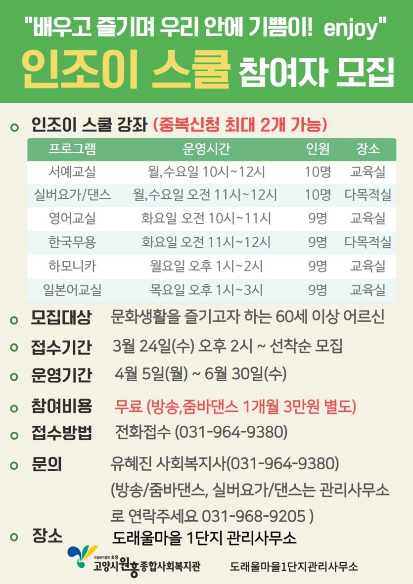 평생교육사업(어르신) - 인조이스쿨 참가자 모집 페이지 정보 작성자 관리자 댓글 0건 조회240회 작성일 21-03-25 12:01 목록 본문 인조이스쿨은 도래울 마을 1단지와 12단지에서 나누어 진행되니 참고 부탁드립니다. 이전글방과후돌봄프로그램 참여자 모집 21.03.31 다음글원흥11단지 저녁요가 참여자 모집 21.03.17 댓글 0 댓글목록 등록된 댓글이 없습니다.