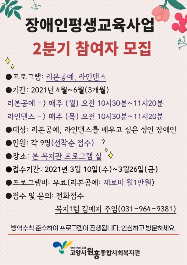 장애인평생교육사업 2분기 참여자 모집 페이지 정보 작성자 관리자 댓글 0건 조회228회 작성일 21-03-09 17:23 목록 본문 이전글2021년 2분기 평생교육사업 참여자 모집 21.03.11 다음글"도래울마을연합회"와 함께하는 마을 청소 성인 자원봉사자 모집 21.03.05 댓글 0 댓글목록 등록된 댓글이 없습니다.