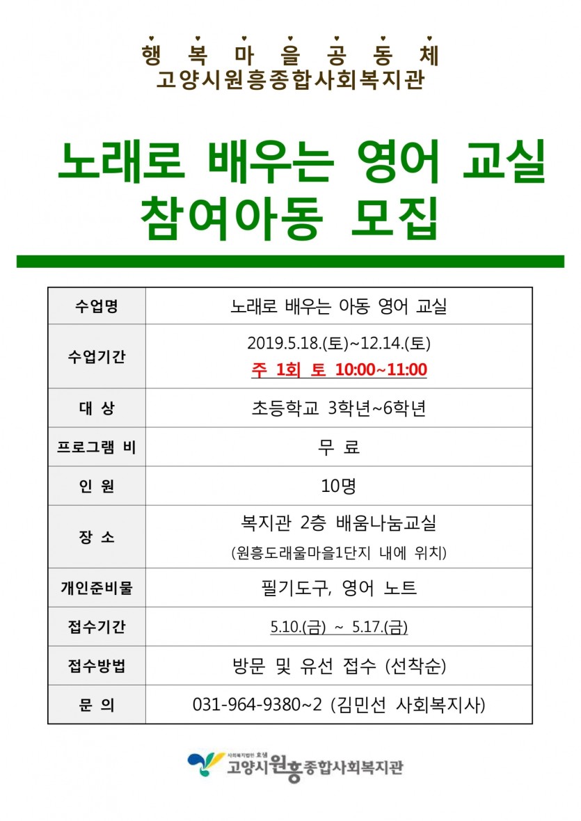노래로 배우는 아동 영어교실 참여자 모집 페이지 정보 작성자 관리자 댓글 0건 조회240회 작성일 19-04-22 21:32 목록 본문 이전글소리낼래 주민모임 회원모집 19.04.05 다음글2019 청소년자원봉사학교 추가모집 (중학교 3학년 해당) 19.08.01 댓글 0 댓글목록 등록된 댓글이 없습니다.