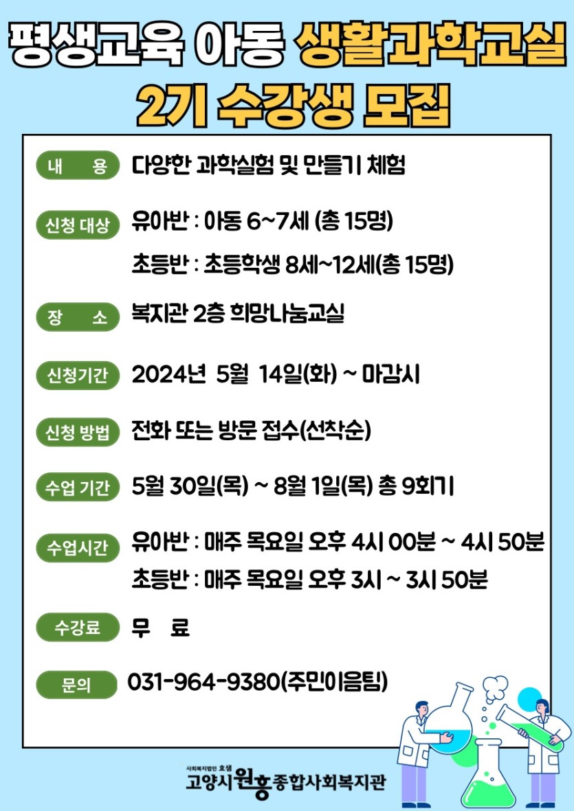 2024년 2기 생활과학교실(유아,초등) 수강생 모집 페이지 정보 작성자 관리자 댓글 0건 조회275회 작성일 24-05-14 11:34 목록 본문 이전글2024년 3분기 연필풍경스케치 프로그램 수강생 모집 24.07.04 다음글2024년 1학기(5~6월) 어르신 평생교육 프로그램 수강생 모집 안내 24.05.02 댓글 0 댓글목록 등록된 댓글이 없습니다.