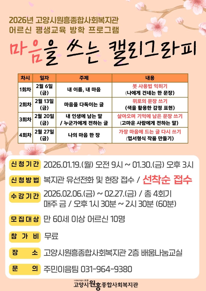 방학특별프로그램 캘리그래피 수강생 모집합니다. 페이지 정보 작성자 원흥종합사회복지관 댓글 0건 조회22회 작성일 26-01-19 15:05 목록 본문 . 이전글방학특별프로그램 여행영어 수강생 모집합니다. 26.01.19 다음글2026년 아동방학특강 프로그램 수강생 모집 26.01.19 댓글 0 댓글목록 등록된 댓글이 없습니다.