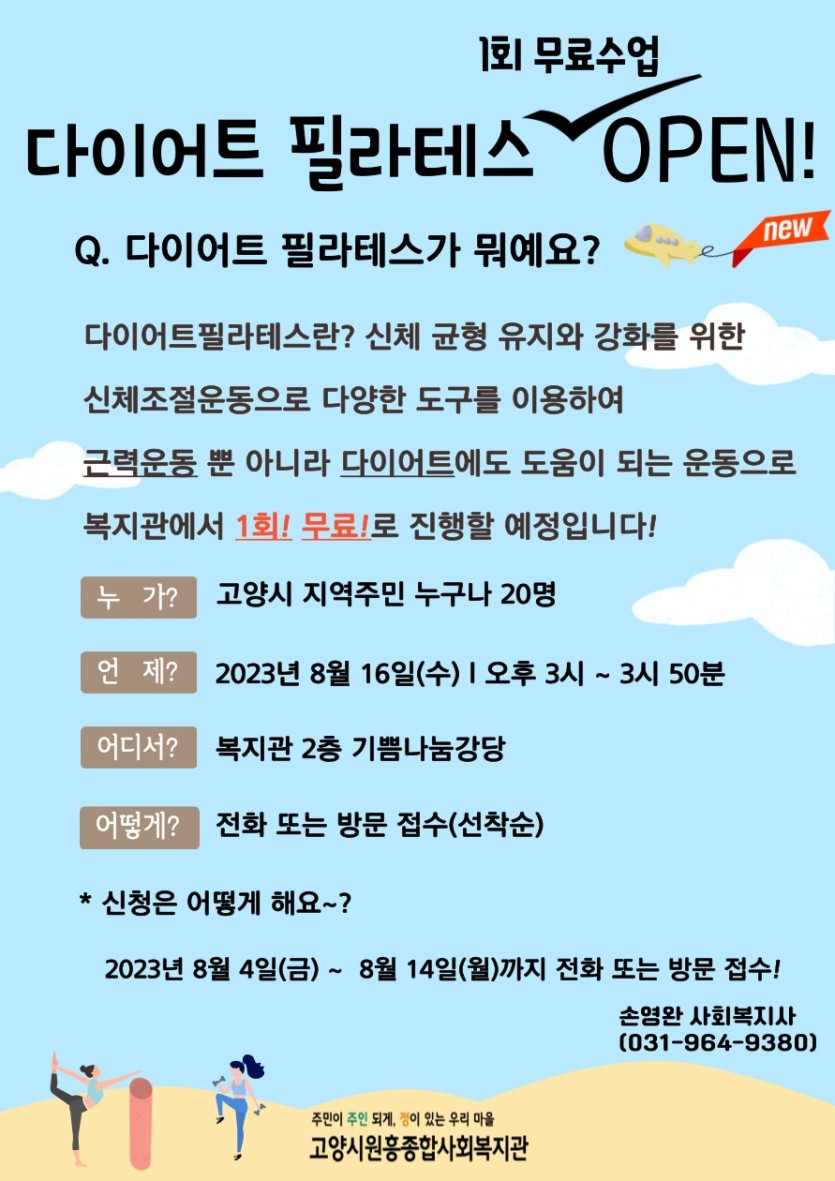 복지관에서 이번에 새롭게 다이어트 필라테스 오픈클래스를 열게 되었습니다.