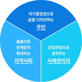 | 사례발굴 | 지역 내 사례관리가 필요한 사각지대 당사자 발굴 및 초기상담을 통해 당사자가 처한 문제 및 욕구 해결 기반 마련 ※ 초기상담, 대상자 발굴활동, 찾아가는 복지상담소 |